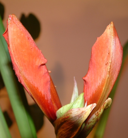 Premestila sam amarilis iz tople prostorije u malo hladniju (10-12,13 stepeni), na svetlo mesto da bi se cvet odrzao sto duze. Ne znam da li sam pozurila sa tim, jer se na drugoj cvetnoj drsci jos nisu otvorili pupoljci.