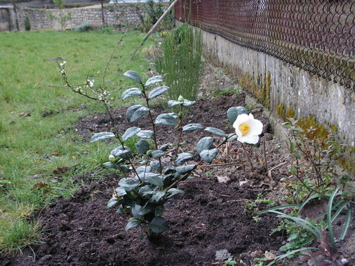 Ovo je Carina, moja bela japonica. prvi cvet, ima ih jos 6. Kramer's supreme (crvena dupla, kasna) me je ove godine bas razocarala - ima samo jedan pupoljak, a roza je jos suvise mala da bi cvetala.