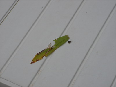 a sada nesto manje veselo: larve izgledaju ovako: okruzene su crnom lepljivom masom, a kada se to skine, cim ih skinete sa lista, one su neke narandzasto-oker boje: