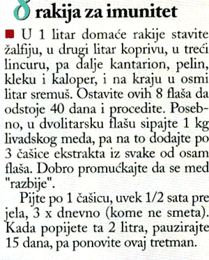 Pošto nisam baš neki stručnjak za recepte na bazi lekovitog bilja, bolje je da to odrade stručnjaci. Zato prenosimi z časopisa ‘Bilje i zdravlje’ ove recepte koji mi deluju zaista dobro.