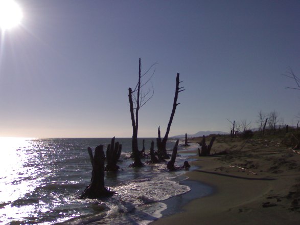 Obala je pjeskovita pa more usled velikih nevremena na neka mjesta nanosi pjesak a na neka gdje valjaju talasi oduzima od obale. Ovo je drvece nesmetano raslo godinama,po mojoj proceni na ovom mjestu more je zaseklo obalu soigurno za 15-ak m. ako ne i vise.