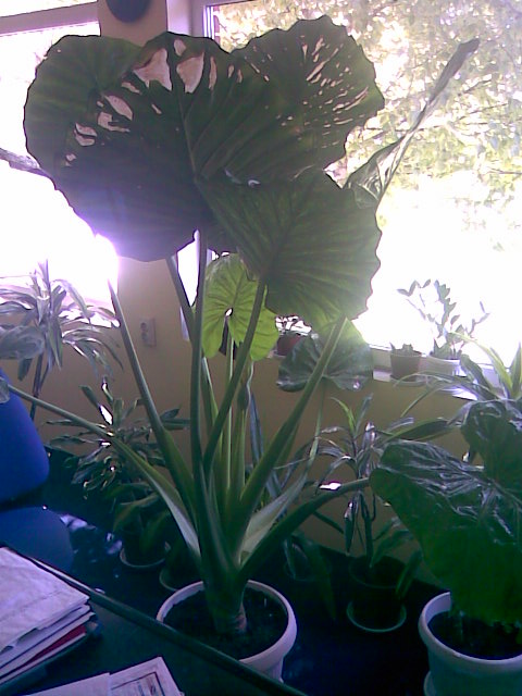 imam ga vec 3 godine, a ovog leta je poludeo!!!!!!!!  stoji u sarenoj hladovini. na slici se vidi ovaj najmanji list, koji je bio najveci kad je on iznesen napolje na prolece. od tada sam ga zalivao djubrivom za listanje, i on podivlja!!!ima 4 lista, sad izlazi 5-ti a onaj se ne susi! i to je interesantno. kad sam ga izneo, saksija je izgledala sasvim normalne velicine u odnosu na njega, a sad vi vidite koliko je on veci!!! evo i slike: