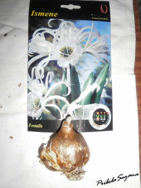 Da napomenem, ta lukovica nije bila posebno spakovana, nego je bilo ono rinfuz pakovanje u velikoj kartonskoj kutiji na kojoj je bila zalepljena slika jednog lepog, narandžastog hymenocallisa (Statua-Dom sindikata) tako da ne znam koja je podvrsta.