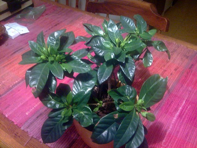 Stare gardenije su mi cvetale letos. Nisu se razbile ali su po cvetak-dva uspele da otvore. Jako puno pupoljaka gube nazalost. Nega nikakva, zalivam ih crevom pa se pritom uprskaju. Stoje ujutru na suncu a od podne u hladu. Valjda sam im ubola poziciju, ne znam.