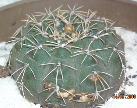 Fenomen promene boje Gimnosa sam primetio još pre par godina kod svog prvog primerka G. michanovichii. Kad sam ga kupio kao formiranu biljku, prečnika 7-8cm bio je jedar i zelen. Posle uspešne sezone cvetanja, sav se smežurao i dobio mrku boju...gledajući ga, obuzimao me strah da je teško bolestan i da će propasti. Sledećeg proleća je izgledao još gore, kao da mu je samo skelet ostao ali je isterao pupoljke i lepo cvetao. Ove godine ista situacija...