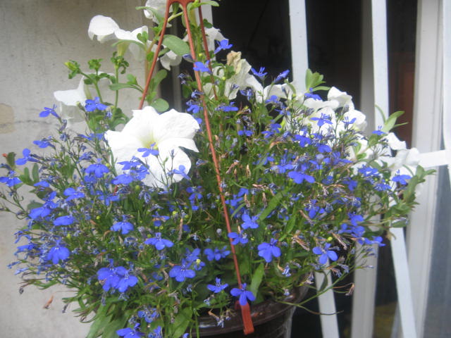 Evo konačno nadjoh malo vremena da uslikam moju lobeliju. Pošto nisam bila sigurna šta će joj ove godine prijati, stavila sam par komada u baštu, par u ćup i par u viseću saksiju. U bašti je lep ukras, ali bolje napreduje u ćupu, mada joj izgleda najviše prija ljuljanje...... u društvu....