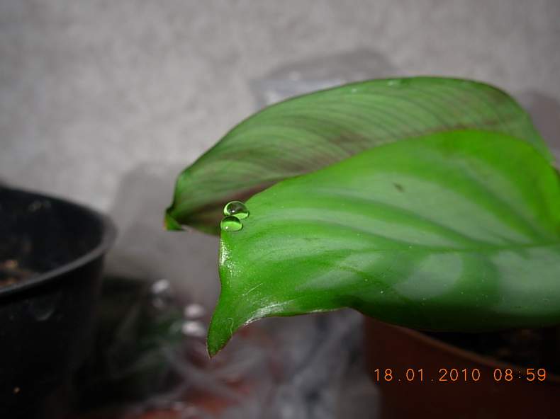 Moram da vam pokažem ovu sliku. Ove kapljice nisu od orošavanja nego su se pojavile same, iz lista. To je mlad pelcer koji je tada imao samo 2 lista a danas izlazi i peti, koji će se odmotati za par dana. Inače, moju calatheu i ne vredi da orošavam: odbija vodu, kapi skliznu dole a list ostane suv kakav je i bio. U sobi ima dovoljno vlage jer tu sušimo veš.