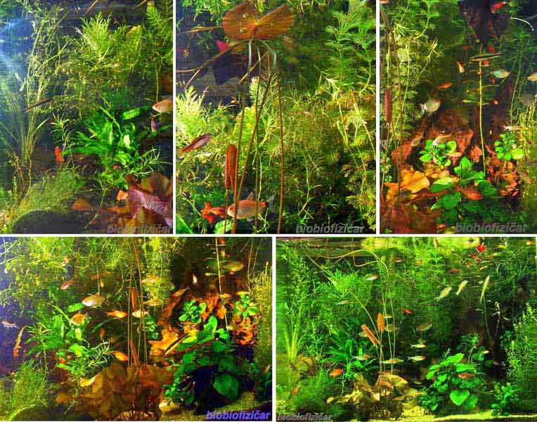 Lepota biljne akvaristike je u tome sto na malom prostoru mozete da se igrate sa ogromnim brojem akvaristickih biljaka. Dimenzije dna ova dva predstavljena akvarijuma su 80x40cm i 60x40cm (ukupno tek nesto vise od 0,5m2) a u njima raste preko 50 vrsta biljaka...