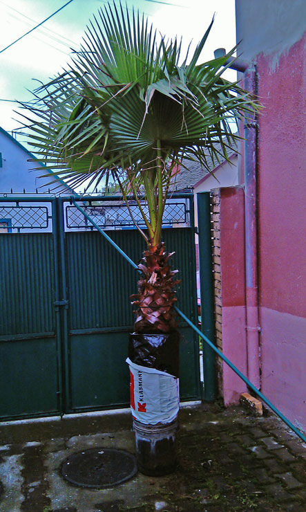 Evo, ovo je nadam se, finale mojih "problema" sa washingtoniom. Upravo sam joj danas uvezao lišće i premestio je (pomoću "mlinskih kolica") iz zadnjeg u prednje dvorište gde je prilaz znatno bolji, a ima i prostora za manipulaciju prilikom utovara i pripreme za transport. Vezana je za štanglu gvozdene ograde i čeka svog novog vlasnika Vlax88  . Zbog ove poslednje kiše koja je padala noćas, teška je "k'o smrt". Ovu noć će provesti tako a sutra pre podne će vlax88 doći po nju.