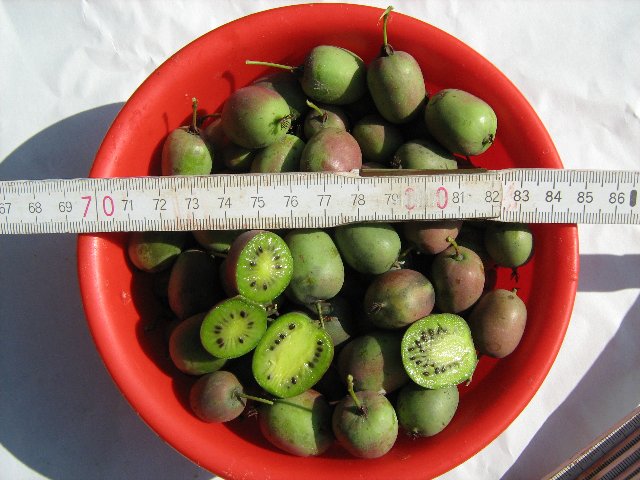 Ovako stoje stvari.Kivi sigirski ,samooplodan,nepoznata imena,posađen 2008 godine u proljeće,kao ukorjenjena reznica,ove je godine prvi puta plodonosio.Na jednom stablu 30.09.10 ubrano je 1832 gr. plodova.Nasumce je uzeto 100 plodova,koji su precizno izvagani,imali su 470 gr,.prosjek ploda je 4,7 gr. Od onih 100 komada izabrano je 10 na oko najvećih,čija je masa bila 70 gr.Proizlazi otud da su najveće bobe teške cca.7 gr.Zatim je uzeto 10 najmanjih boba,koje su težili 25 gr.Proizlazi otud da najmanje bobe iznose samo 2,5 gr.Plodovi počinju mekšati od strane cvijeta tj,suprotno peteljci,Okus je sličan običnom kiviju,ali blaži ,tj nije toliko kiseo.Potpuno meke bobe su tako reći bljutave,nemaju dosta kiseline.Najbolje za konzumaciju su one bobe koje su počele mekaniti ,a još su kod peteljke tvrde.Pogledom unatrag po ovoj temi može se vidjeti vreme cvetanja,pa se može zaključiti koliko je potrebno..itd.itd..Ako sam nešto zaboravio,možete mi se obratiti ovde na temi