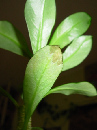 Medjutim sada imam i problem, desava mi se sledece: Pogledajte dole na slikama, ta situacija je vec bila na nekim adeniumima pa sam im preventivno otkidala taj list jer sam mislila ako je nesto sto se siri da to sprecim. Takodje sam i odmaknula sijalicu jer sam mislila da je to na listu mozda spaljeno ako je preblizo sijalica ali eto desilo se opet. Sada je na mom najlepsem i najnaprednijem adeniumu starom 3-4 meseca. Ta fleka sto vidite na listu je suv list, znaci nije mekan, kao gnjil vec bas suv. Nije promenio boju tako da se odozgo jedva vidi (sto je takodje prikazano na slici) ali odozdo se jasno vidi!? Bitno je reci isto da nisu u pitanju kotiledoni vec lepi i zdravi listovi. Trenutno situacija je takva na ovom jednom adeniumu ali kao sto kazem bila je na jos dva, pre nekih dve nedelje, pa sam te listove otkinula. Ne mogu bolje da vam opisem, jednostavno krene iskljucivo od vrha lista i kada se dodirne potpuno je taj vrh suv, cak suska kao jesenje lisce....Pomagajte molim vas!!!
