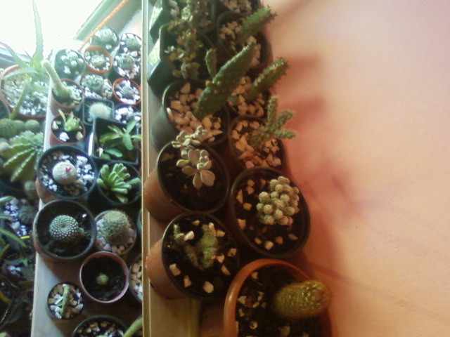 Au,Sanja kod tebe baš gužva.Presadi onaj kaktus i odvoj male jer ti neće cvetati(ja mislim da čak i nema zemlje).Baš si napravila lepu kolekciju.
