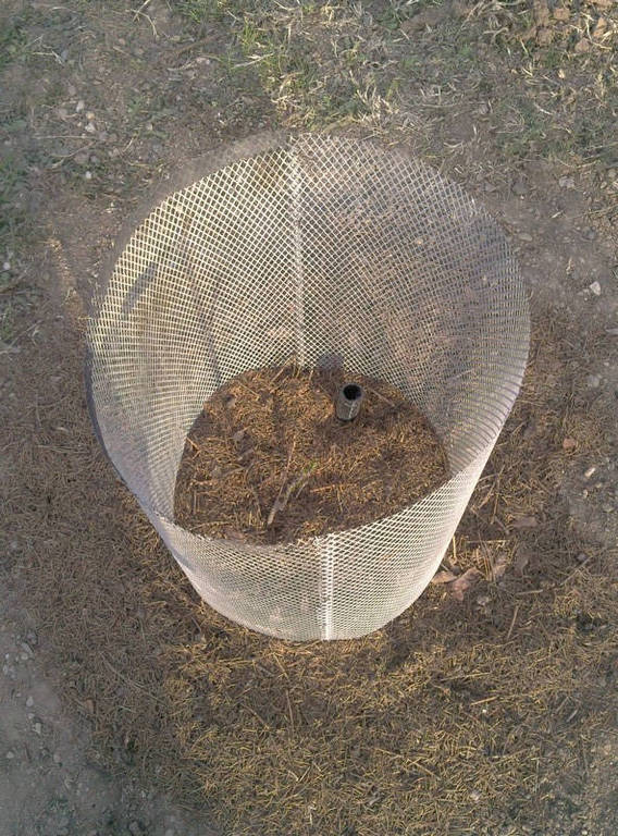 Petrohemijina PVC cev od cola gusto perforirana u donjoj polovini burgijom od 2 mm aispod i oko nje sitan pesak - direktno zalivanje korena kako inače praktikujem i kod voćki prve 3 godine. Ovo je trebalo da ide uz fotke ali....