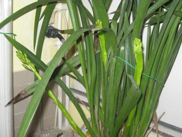 moram da se pohvalim. Prosle jeseni sam kupila cymbidium za 250din na Novosadskoj jeseni kao pelcer bez saksije onako u kesi sa dve pseudobulbe. Evo godinu dana kasnije obradovao me je pupoljcima. Nikakvu posebnu negu nije imao posto imam bebu. Celo leto je bio na terasi u sarenoj hladovini, povremeno potapanje i na jesen sam ga ubacila u sobu. Ne znam koje je boje, to ce biti iznenadjenje naravno ako se otvore pupoljci  .