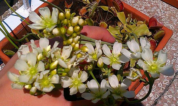 Kod mene cvetaju samo biljke čiji je prečnik cvetne drške veći od 4mm. Ako su manje od toga, biljke se baš muče, mogu i da uginu, a cvetova bude malo. Tvoja biljka izgleda dobro, kao i cvet. Nabavi još jednu veću muholovku, pusti ih da cvetaju i rastu i ne presađuj ih do proleća 2015. Imaćeš gomilu biljaka i semenki.