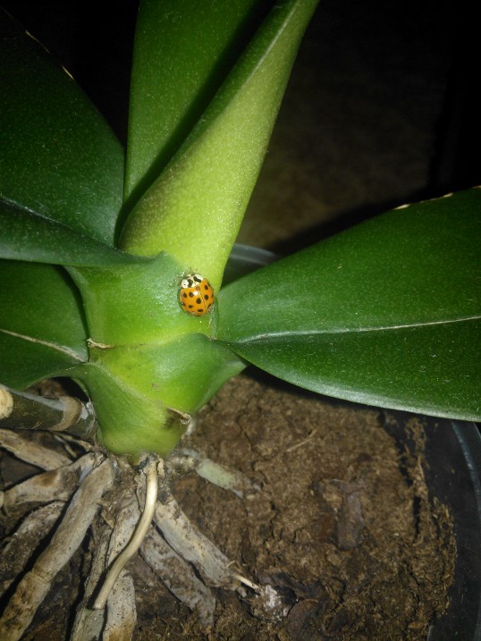 Nema ništa bijelo i ljepljivo, ona bijela fleka se više ne pojavljuje, samo ona providna ljepljiva tečnost. Prošle sedmice sam obrisala listove deterdžentom za suđe i juče vidim da su se opet pojavile. I evo maloprije je uzeh da prebrišem alkoholom i vodom, kako mi Monk reče, kad ugledah bubamaru na njoj, i nađem na netu da se bubamare hrane tim gamadima, pa sam je ostavila, a obrisala sam samo vrh lista, gdje se nalazila ta ljepljiva tečnost, da ne uznemiravam puno bubamaricu. Sad čekam da vidim šta će dalje biti. Razmišljala sam da ako ni ovo ne pomogne nekoliko puta, da je izvadim iz supstrata i držim onako bez saksije nekih sedam dana, a da joj samo korijen orošavam da ne bude žedna, pa da ih se tako probam riješiti. Izvještavaću o daljem toku borbe protiv vaši.