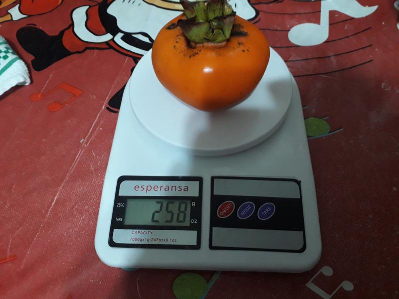 Ove godine jos nije bilo mraza, pa sam ostavio jedan Fuyu na drvetu da umekne i naravno puno sladji od onih koji se pojedu tvrdi...
