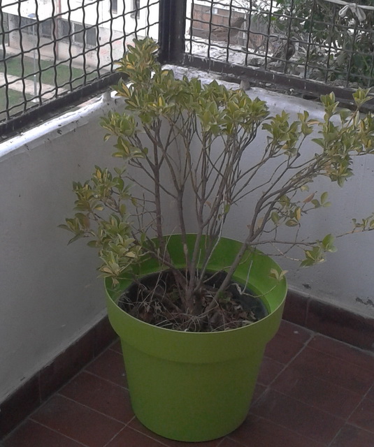 Stablo mu je boje drveta a grane žute  , listovi su žuti sa zelenom ivicom. Kako da ga negujem, nemam pojma sa žbunjem i drvećem koje se sadi napolju, ali u saksiji?