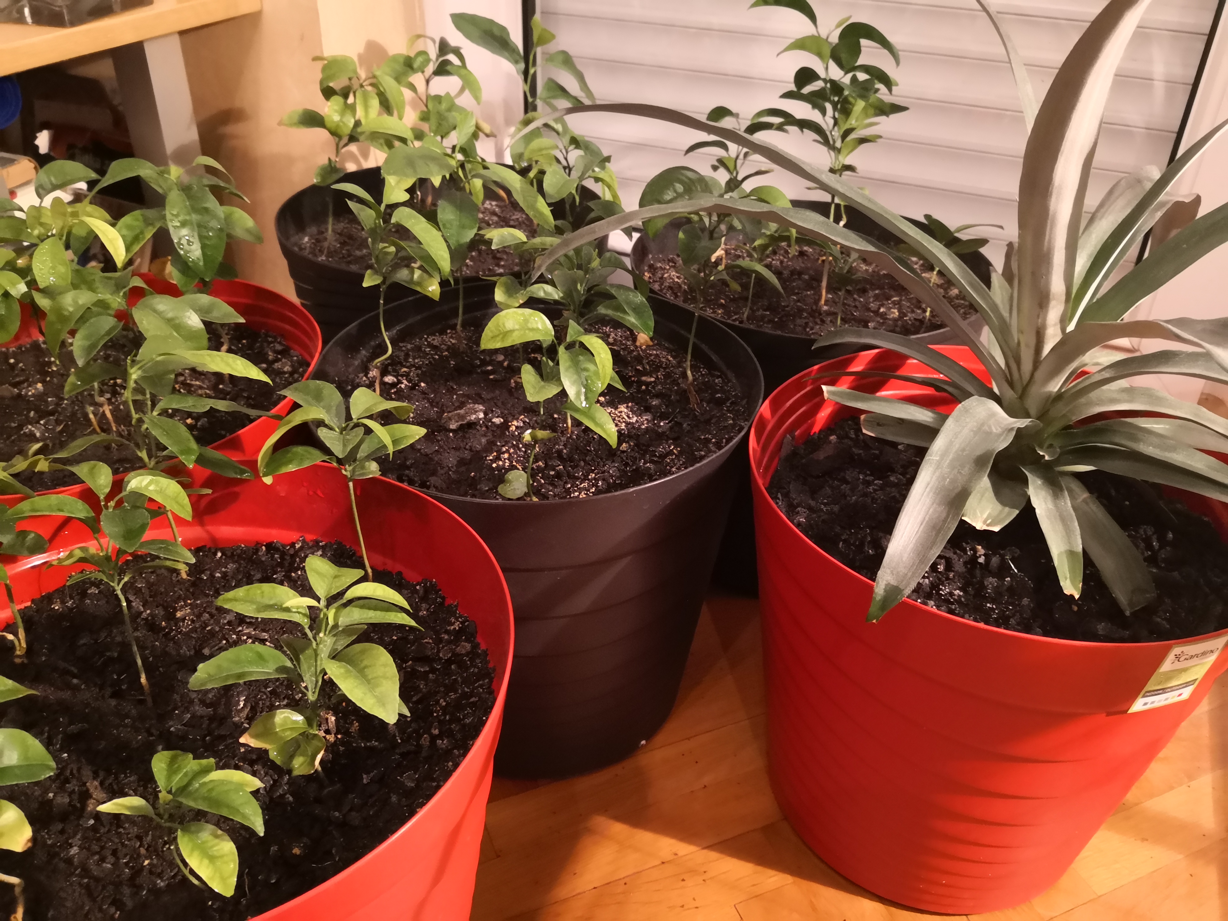 Moji mali citrusi, stari oko 8 meseci. Nikli su iz semenki. Nemaju baš previše prirodne svetlosti. Dodao sam veštačko LED svetlo 5W. Na sobnoj temperaturi su. Zalivam ih svakih nekoliko dana, ne previše. Jednom u dve nedelje im u vodu dodam Blumi za citruse. Ima ih 35 u pet saksija. Orošavam ih skoro svakog dana. Jedan je pobacao skoro sve listiće. Bojim se da i ostali ne krenu tim putem