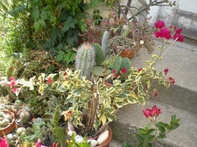 Primera radi, ove godine sam htela da poslusam savet Denisa Bojcica, coveka koji je posvetio svo svoje vreme bugenvilijama i hibiskusima i ima sigurno jednu od najvecih kolekcija bugenvilija na ovim, a i evropskim prostorima. On savetuje da se biljke orezuju u rano prolece. Tako sam uradila i rezultat nije bio kakav sam ocekivala. Biljke su krenule kasnije, cvetanje se tek sada zahuktava, bela je tek sada napravila pupoljke...crvena - slabo, grabra kojoj se inace ne vide listove od cveta sada ima tu i tamo pri vrhu.