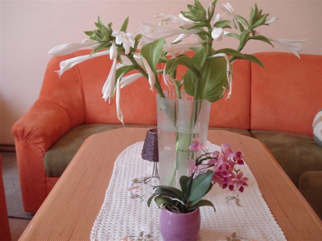 Ovaj put se javljam iz dnevne sobe.Da barem mozete osjetiti miris hostinog cvijeta. Patuljasta orhideja zivi u mojoj ordinaciji, ali buduci da sam na godisnjem odmoru i ona je dosla kuci.
