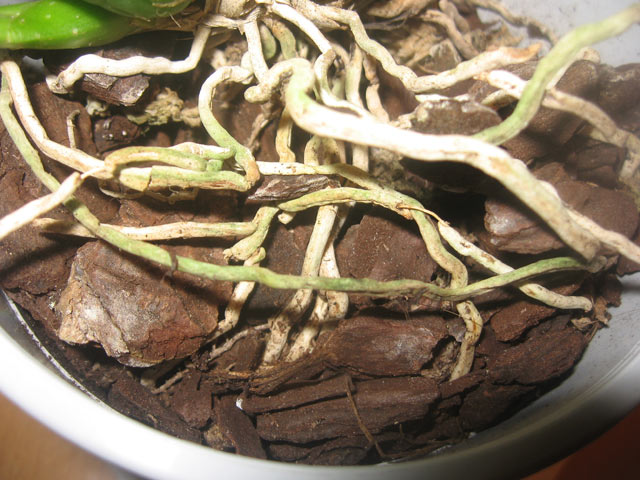 Ovdje se radi o ocnidiumu. Biljka nije presadjivana, lisce je zdravo i tvrdo. Sva se nagnula u jednu stranu kao da ce ispast iz vaze. Zracno korjenje je na dodir jako suho i suplje a ono najcudnije - zelenkaste je boje. Iz dna vaze vire dva korjena, isto jako suha.