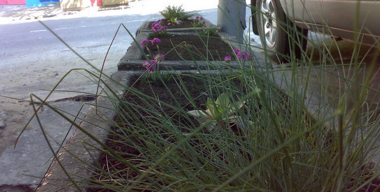 Gazanije ili prkosi (ali samo ako ima dosta sunca) za brzo i poprilicno jeftino cvijetno rijesenje -prilicno su gusti i otporni za ovako izlozeno mjesto. Da zaboravis kad si ih posljednji put zalio...