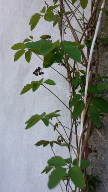 Pored nje na zidu cveta i tekoma. Akebija se dosta visoko popela uz kanape koje sam joj vezala kao potporu.